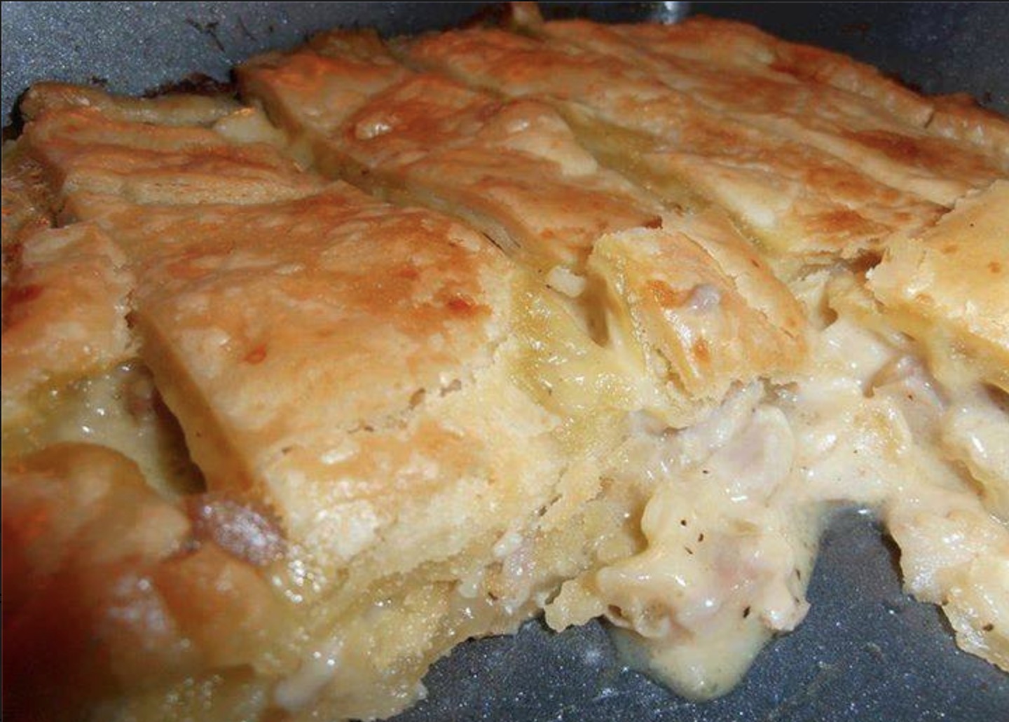 Lightly spray a 9×9 baking dish with cooking spray. Spoon half of the chicken mixture into the bottom and spread around. Then cover the mixture with a layer of the pie strips. Dot the strips with 1 T. of butter and place in a 400 degree oven for 25 minutes. Remove and spoon the remaining chicken mixture over the top, then place the remaining pie crust strips. Again, dot with 1 T. butter. Return to the oven for an additional 25 minutes or until golden brown. Remove and let sit 5 minutes before serving.