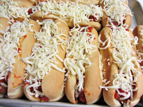 - Fill a roll with as many meatballs as you can fit (usually 4-5 meatballs, depends on size of meatballs and the size of the roll). Top with more pasta sauce from your pot. Place filled sandwich rolls closely on baking sheet. Top each sandwich with shredded mozzarella cheese.
