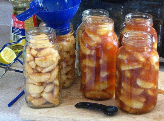 Core, peel and slice apples. Place in boiling water for 1 minute. Set aside and keep hot. Boil remaining ingredients until desired thickness. Barely let it reach a full boil. Fill hot sterilized quart jars alternating apples and syrup until it is almost full. Run a knife down the side to remove air bubbles. Add more apples and syrup. “Process in boiling water bath. Put jars in water bath pan or one that allows you to put water over the jars about 1 inch. Boil for 25 minutes”.