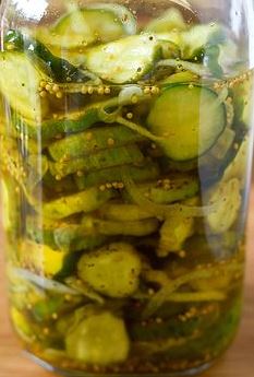 Slice the veggies into 2 quart jars, I like to make layers of them: you can leave out the onions and peppers, if you want, but they are so good!~Mix your other ingredients in a large measuring cup, stir well. The sugar will not be dissolved yet~Pour over sliced vegetables, evenly in each jar~You will finish filling the jars with cold tap water~I shake the jar a few times during the 24 hrs to mix~No need to cook it~ Ready to eat in 24 hours. Taste best if eaten within a week or two~but I like to add tomato wedges or slices to this liquid for overnight, when it is close to empty of veggies~Use the next day~Unbelievable with sandwiches~ ~I have also pickled hot peppers using a batch of this same liquid~They are delicious!~