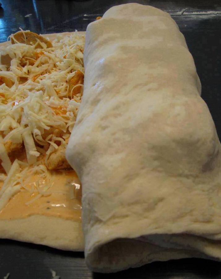 Add ranch dressing or blue cheese dressing (depending on your preference!) and remaining 1/4 cup of wing sauce. Spread across the dough. Add chicken and then top with mozzarella and cheddar cheese. You can also add a bit more of the wing sauce on top of the cheese if you want it to be a little bit spicier.