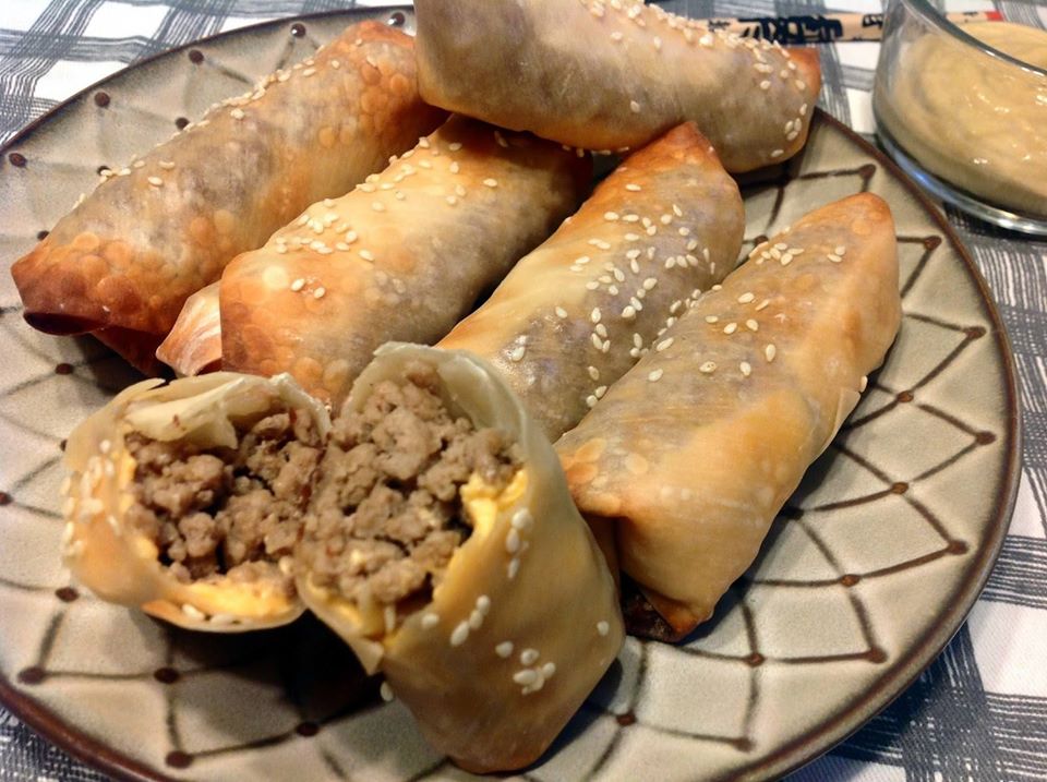 Preheat oven to 350 degrees. In a large skillet, brown ground meat over medium high heat. When the meat is browned and cooked through, season with Worcestershire sauce, salt, onion powder, garlic powder and pepper. Remove from heat. Start wrapping rolls by laying an egg roll wrapper on a work surface. Place 1/2 of a slice of American cheese from corner to corner on the wrapper. Top with 3 tablespoons of ground meat. To roll the wrapper, fold over the corners over the ground meat. Next, fold the bottom corner over the already folded sides and start to roll. Seal the one remaining corner with water and finish rolling. Lay finished roll on a baking sheet seal side down. Repeat until the rest of the meat is gone, about 12 rolls. Brush with olive oil and sprinkle with sesame seeds. Place in preheated oven and bake for 15 minutes or until golden brown. Serve with mustard or barbecue sauce and enjoy!
