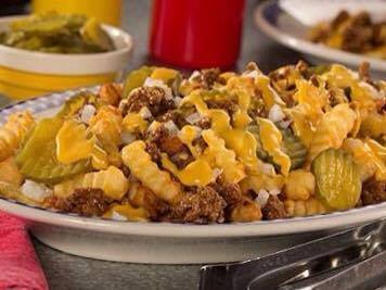 On a large platter, arrange the french fries and pour the mixture over them. Sprinkle onion and pickles over the top and top with cheese sauce.