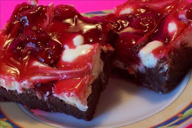 Spoon the entire cheesecake batter on the top of the brownies and then drizzle the remaining juice on top of that.