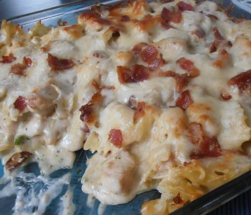 Cut chicken into bite sized pieces, coat with 1/2 packet ranch seasoning. Saute in a skillet with 1 Tablespoon of bacon grease along with bell pepper and garlic. When chicken is cooked completely, drain grease from skillet. Pour one jar of alfredo sauce and milk into skillet with chicken. Stir in the rest of the ranch seasoning. Simmer for five minutes. Set aside a handful of bacon crumbles for top. Begin layering casserole with half the remaining jar of Alfredo on the bottom of a 13 x 9 pan. Then layer 1/2 of the pasta, chicken sauce, and bacon, followed by 1 cup of cheese. Repeat. Finally cover with alfredo sauce, 3rd cup of cheese and bacon that had been set aside. Bake for 30 minutes on 350. Serve with garlic bread. ENJOY!!