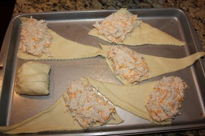 Combine chicken, cheeses, salt and pepper. Spoon onto crescents. Roll them up making sure they are sealed around the chicken mixture. Brush tops with butter and sprinkle with bread crumbs. Bake at 350 for 20-25 minutes. To reheat, just place in a 325 degree oven for 15 minutes.