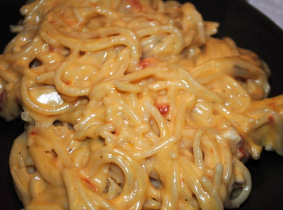 1 lb boneless, skinless chicken breasts1 lb Velveeta cheese, regular or mexican1 can(s) Rotel tomatoes, regular or hot1 lb spaghetti pasta1 stick butter1 can(s) cream of chicken soup, undiluted1 can(s) cream of mushroom soup, undiluted1 medium onion, chopped1 bell pepper, red or green, choppedsalt and pepper to taste