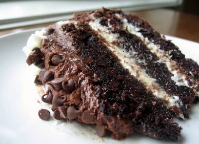 Place the bottom layer on a cake plate. Evenly spread about 3/4 cup of the cream cheese filling over the cake, leaving about 1/2 inch margin around the edges. Top with the second layer and repeat. Finally, top with the third layer. Apply a thin layer of chocolate buttercream over the top and sides of the cake. This is only a crumb coat, so it doesn’t need to be perfect. Refrigerate the cake for about 30 minutes.