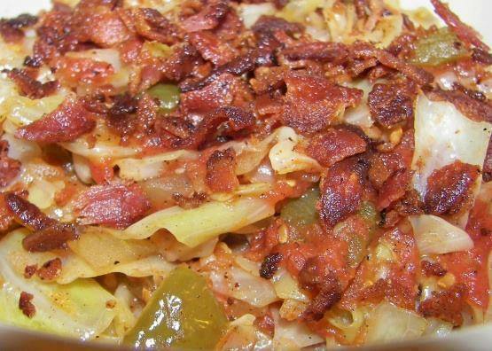 Add cabbage, sugar, salt, pepper and tomatoes. Bring to a boil, reduce heat to medium low. Cover and cook 5-8 minutes. Top with crumbled bacon and serve.