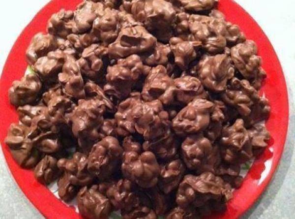 1 Layer all ingredients in a large crockpot (starting with peanuts). Turn the pot on low, cover with lid, and leave sitting for 2 hours. Then, remove lid and stir to combine. Replace lid and leave sitting for another 30 minutes. Stir again and then spoon mixture on to wax paper or non-stick aluminum foil. Allow to harden for at least 1 hour. Enjoy!