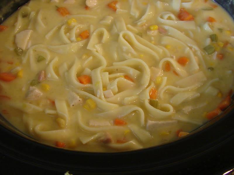 Melt butter in a skillet. Add onions, carrots, and celery and saute for about 4-5 minutes or until veggies are just soft. In a slow cooker combine chicken stock, cream of chicken soups, and evaporated milk. Whisk. Add cooked chicken, sauteed vegetables, and corn. Cook on low for 3 1/2 to 4 hours. Add noodles, cover, and turn slower cooker to high. Cook on high for 1 more hour. Serve with bread or crackers.
