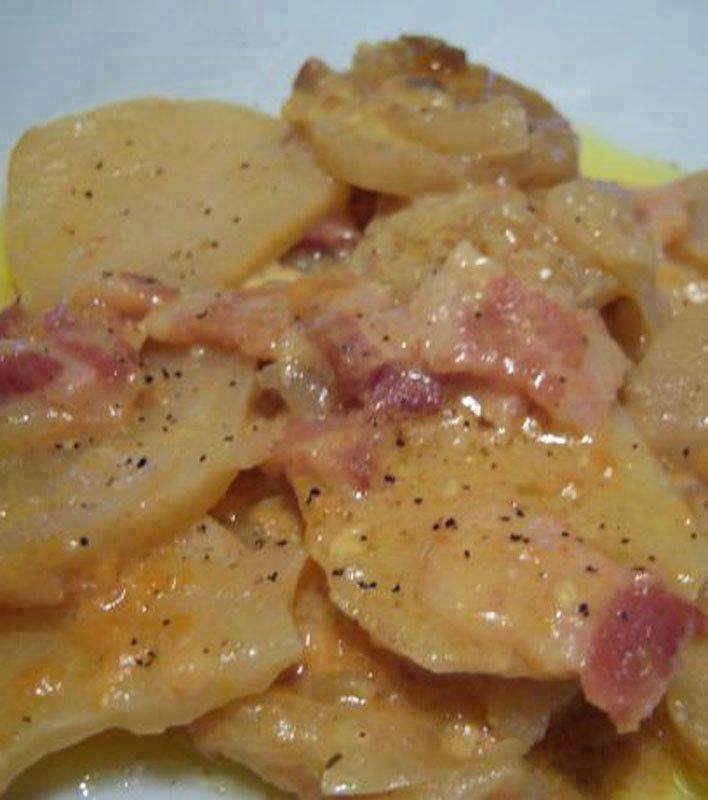 Peel and slice potatoes, dice onion. Layer potatoes, onions, cheese, bacon in this order.