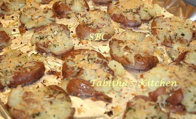 Preheat oven to 425 degrees. Boil the baby potatoes in salted water until fork tender. Cover baking sheet with foil and drizzle olive oil on the baking sheet. Space the potatoes on the lined baking sheet sheet and mash them gently with a fork or potato smasher.