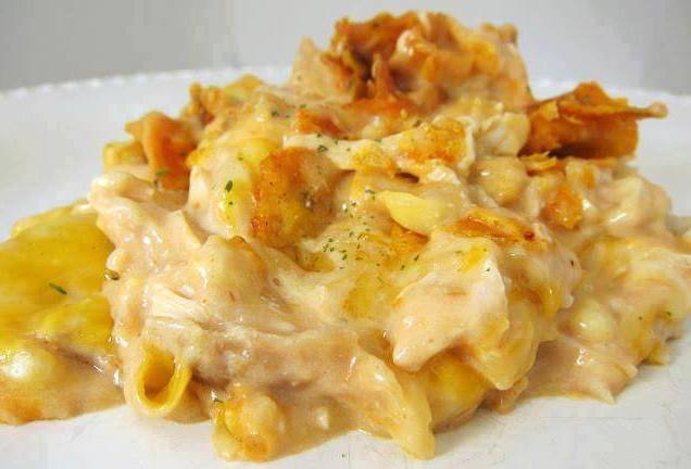Lightly spray a 9×13 pan with cooking spray. Spread the bottom of the pan with half of the Doritos . Reserve one cup of cheese. Mix together remaining ingredients in a large bow. Pour chicken mixture over the Doritos. Top casserole with the remaining cheese and Doritos. Bake 30 minutes or until bubbly.