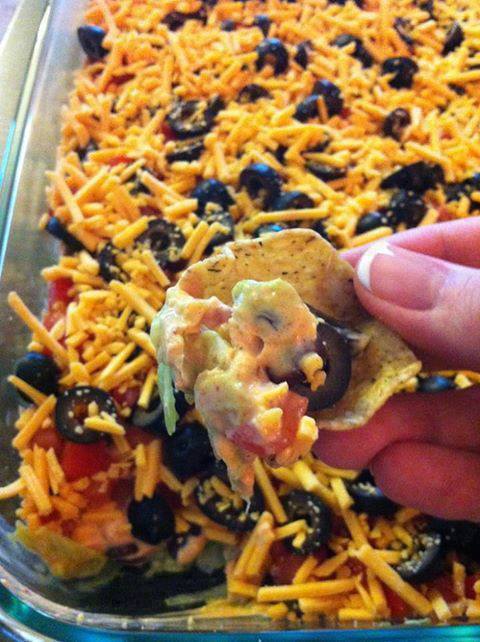 Starting with the lettuce on the bottom of a bowl, add each layer on top of the next, ending with sprinkling the cheese on top. Alternate one celery stick with each whole grain chip to cut your calories in half.