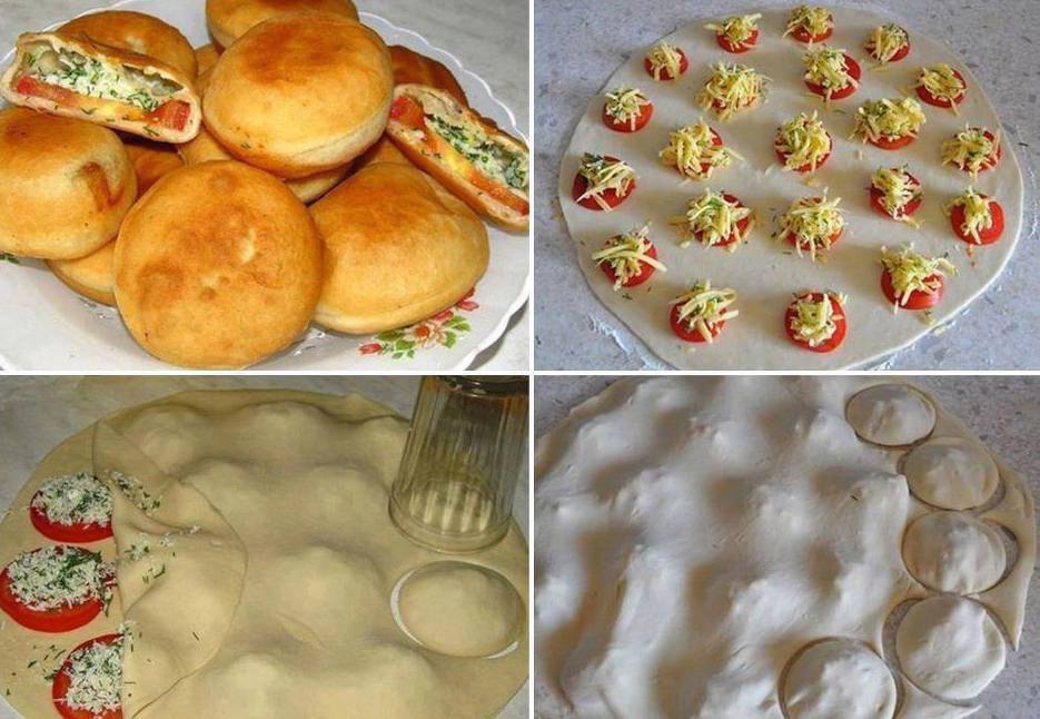 add another sprinkle of cheese over the top of the tomato. Gently place the top pie crust or pizza crust over the top. Seal all the way around. Take a drinking glass and gently cut out each bump of tomato. Make sure each round Calzone is sealed. Use a little water to ensure seal.