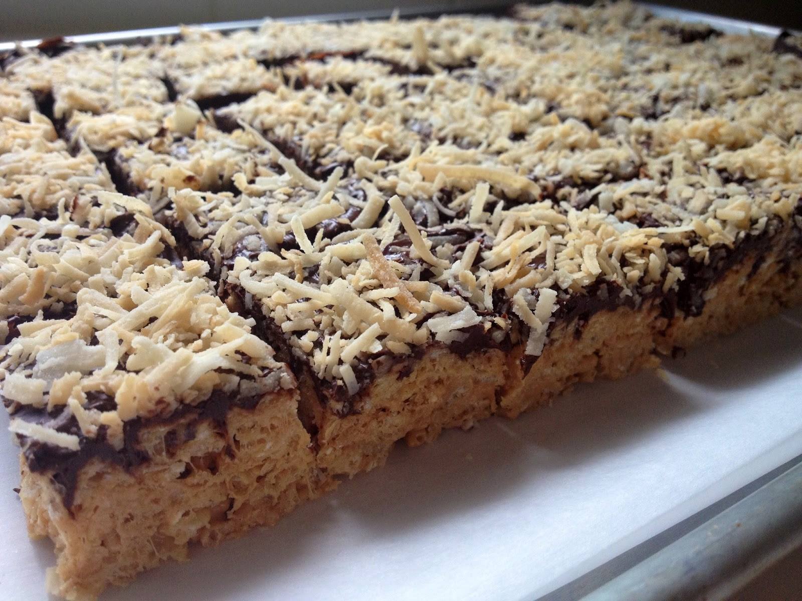 9. Add melted chocolate on top of the Rice Krispies layer. Use spatula to even it out, so the Rice Krispie layer is completely covered. Sprinkle toasted coconut on top of the chocolate.