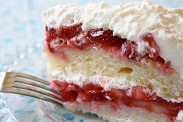 Layer half the berries & juices on bottom cake & cover with cream.