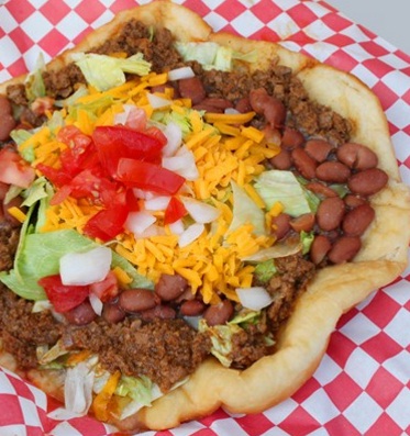 Top each fry bread with beans, ground beef, lettuce, cheese, and picante sauce.