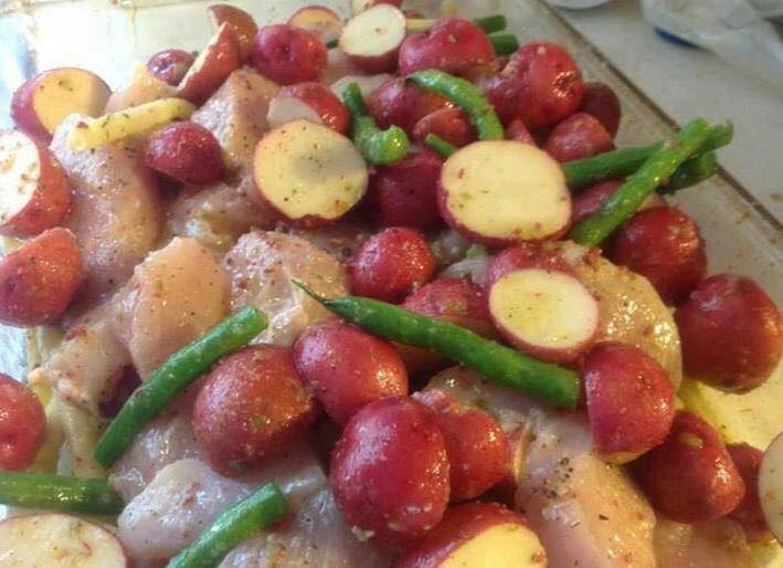 In a large bowl, combine the remaining oil, lemon juice, garlic, salt, and pepper; add the chicken, green beans and potatoes and toss to coat. Pour this mix into the pan and spread around evenly.