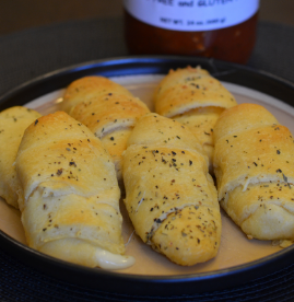 Unroll the crescent rolls and separate into triangles. Place a string cheese horizontally at the bottom of the triangle, fold in the sides and roll up to form a croissant-shaped rolls. Brush the top with the garlic herb butter.