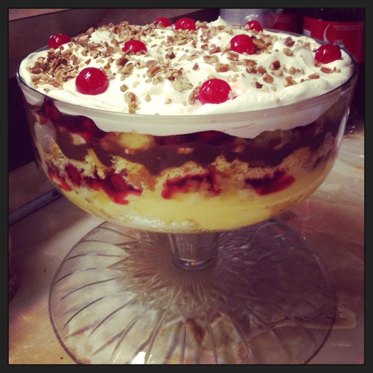 1st layer ~Crumble 1 layer of cake in bottom of bowl, add 1 can cherry pie filling, 1 box prepared pudding, and 1/2 tub cool whip.