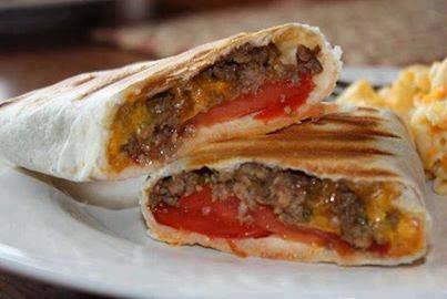 Brown ground beef in large skillet and drain. Add Worcestershire sauce, ketchup, dried onion, and salt and pepper to the beef and simmer for 5 minutes. Sprinkle shredded cheese down center of each tortilla. Add a few heaping tablespoons of the beef mixture on top of the cheese. Spread some mustard on top of the beef along with some slices of tomato. Roll up tortilla burrito-style and place wraps on preheated indoor grill (I used my George Foreman).
