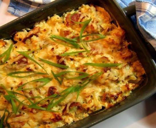 5 Place in medium baking dish and sprinkle remaining cheese and bacon on top.