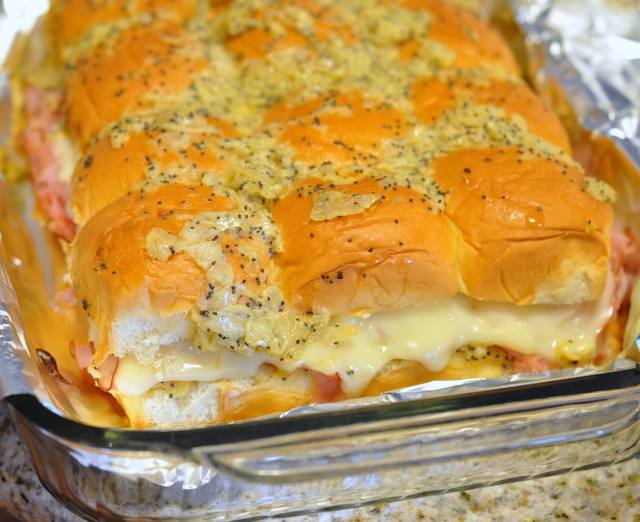 Spray a 9×13 casserole dish with non-stick spray, place bottom half of rolls, and spoon 1/2 of the onion mixture over the rolls.