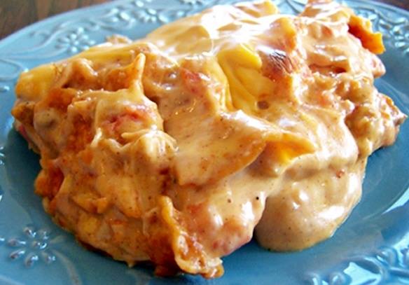 In a greased 2 qt baking dish, put a layer of crushed doritos (about 2 cups), then a layer of the chicken mixture. Repeat once more, ending with a layer of chicken mixture. Top with more shredded cheese, cover, and bake for 30-35 minutes, till bubbling hot.
