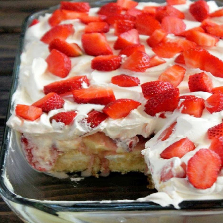 Lastly, place extra diced strawberries on top of whipped cream layer, cover with saran wrap and refrigerate for about 3 hours.