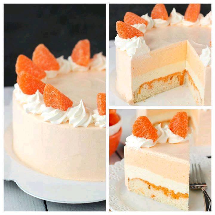 7. To finish off the cake, ice the outside with additional Cool Whip. You can use gel icing color to make it orange, if you prefer. Pipe additional Cool Whip around the top edges and top with orange candy slices.