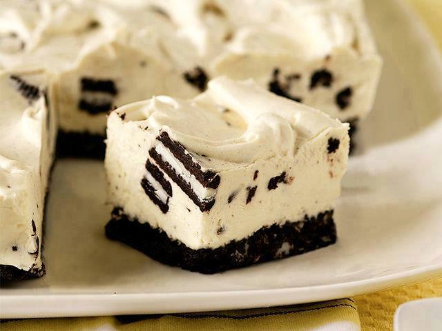 Chop 15 cookies coarsely. Finely crush remaining cookies; mix with butter. Press onto bottom of 13×9-inch pan. Refrigerate until ready to use.
