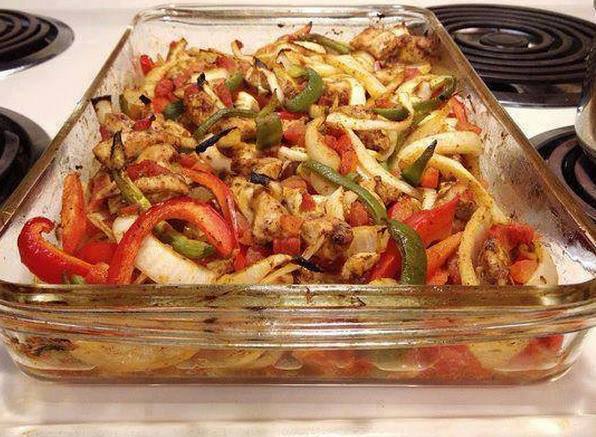 Next add the tomatoes, peppers, and onions to the dish and stir to combine. Bake uncovered for 20-25 minutes or until chicken is cooked through and the vegetables are tender.