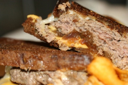 Layer 1 bread slice with 1 tablespoon Secret Sauce, 2 to 3 tablespoons caramelized onions, 1 slice cheese, 1 patty, and another 1 tablespoon Secret Sauce. Top with another bread slice. Repeat with remaining bread, Secret Sauce, caramelized onions, cheese, and patties.