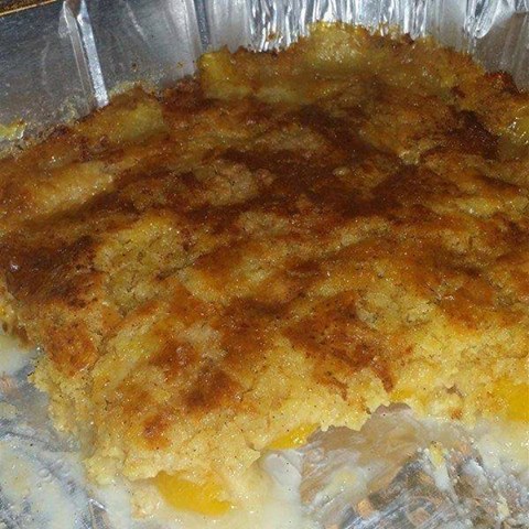 Preheat oven to 375 degrees F (190 degrees C). Empty peaches into the bottom of one 9×13 inch pan. Cover with the dry cake mix and press down firmly. Cut butter into small pieces and place on top of cake mix. Sprinkle top with cinnamon. Bake at 375 degrees F (190 degrees C) for 45 minutes.