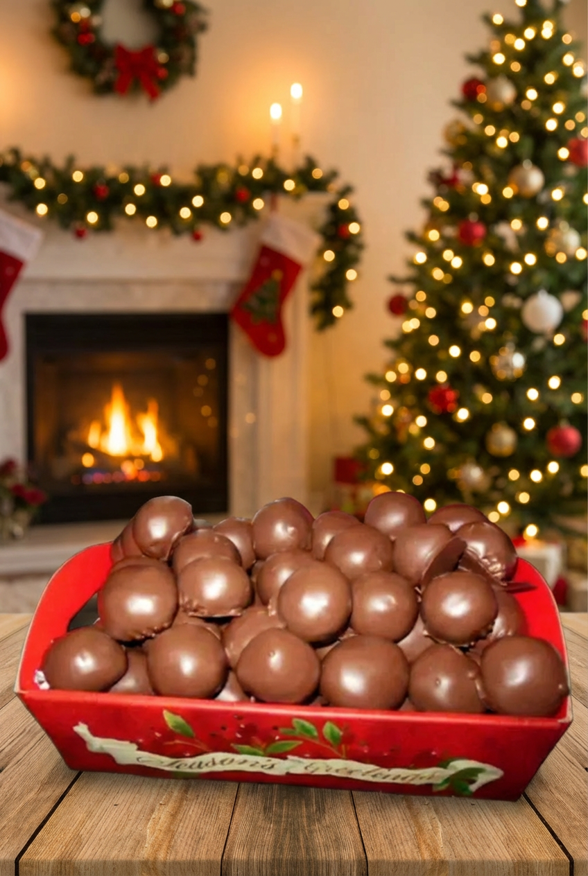 Melt the chocolate chips over low heat. Roll the dough into 1 inch balls. Dip into melted chocolate chips.