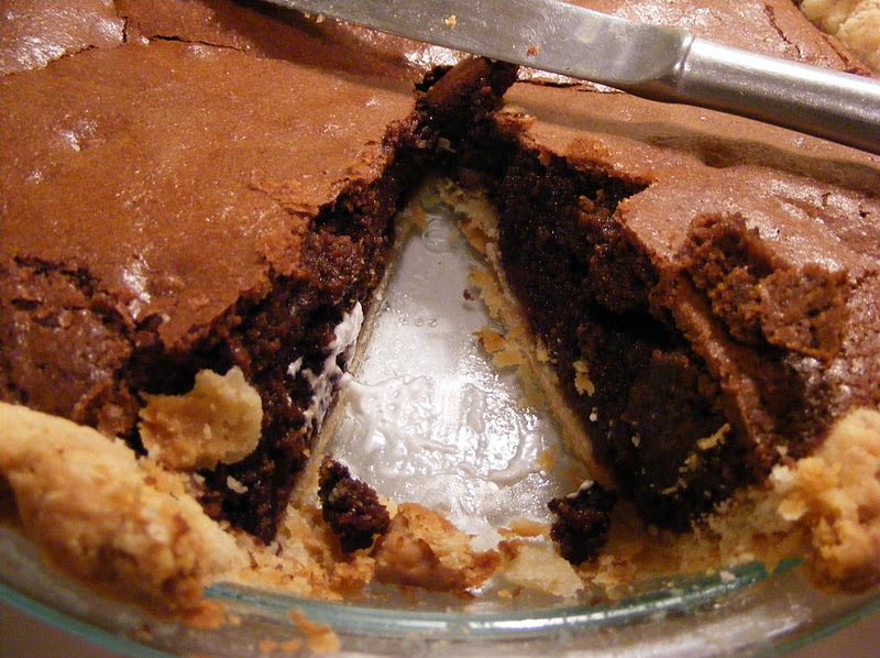 3. For filling, in a large bowl, combine eggs, sugar, flour and vanilla. Stir in melted chocolate and the chocolate pieces (and pepper mint extract if substituting.) Pour filling into the pastry-lined pie plate.