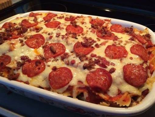On top of pasta, layer the ground meat, then add a layer of pepperoni Sprinkle parmesan cheese, and Italian cheese. And another layer of pepperoni. Top with bacon bits and anything else you like just like a pizza!