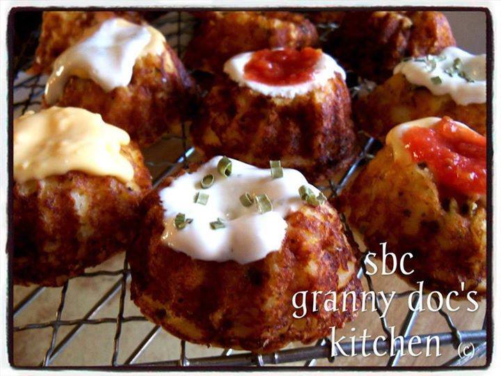 Directions Preheat oven to 400 degrees F. Lightly grease with butter 8 – 9 of the wells of a nonstick muffin pan. In a medium mixing bowl whisk the eggs then mix in the sour cream. Stir in both cheeses and the chives. Add potatoes and mix well. Spoon them into the pan filling the cups to slightly below the top. Bake 25- 35 minutes until they pull away from the sides of the cup and are golden brown. Remove from oven and let them cool 5 minutes in pan.