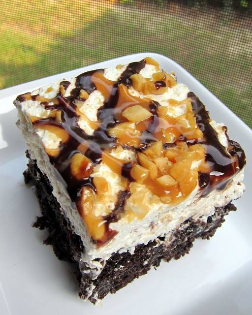 In a chilled bowl, whip together heavy cream, powdered sugar and vanilla. Whip on high speed of an electric mixer for 1-2 minutes. Stir in chopped snickers. Spread over cake. Sprinkle chopped peanuts over cake. Drizzle caramel and chocolate sauce on top. Chill.