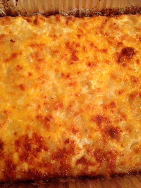 Layer one half of the cooked macaroni in the bottom of the baking dish. Sprinkle with 2½ cups of shredded cheddar cheese.