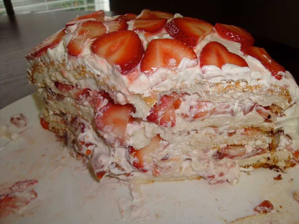 6. Spread the cool whip strawberry mixture on top of the cake and top with fresh strawberries.
