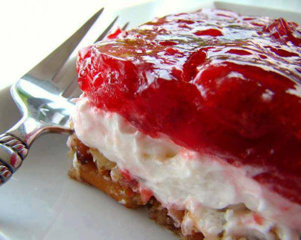 Preheat oven to 400°F. Stir together crushed pretzels, melted butter and 3 tablespoons white sugar; mix well and press mixture into bottom of 9 x 13-inch baking dish. Bake 8-10 minutes, until set; set aside to cool.