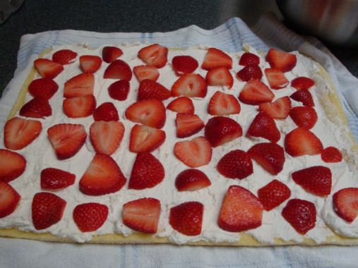 To fill cake: wash and dry the berries very well. Slice about 3/4 of the pound into small pieces, then pat the pieces dry. Carefully unroll the cake. Spread with some of the whipped cream mixture and top with the chopped strawberries. Carefully roll the cake back up as tight as possible, unsticking it from the towel as you go. Wrap the cake roll in plastic wrap and chill until ready to top and serve.