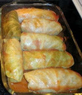 Mix all ingredients together except the 15 oz can of tomato sauce and crushed tomatoes and put a small amount (size of a sausage) on a cabbage leaf, and roll up like a fajita and place seam side down in a casserole dish. I put tomato sauce and a cabbage leaf or 2 on the bottom of the casserole dish so the Halupky won’t burn.