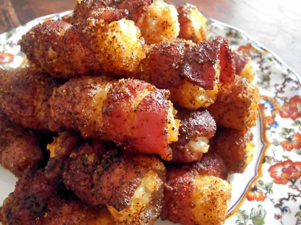- Wrap each thawed tater tot in bacon and then roll it in the brown sugar mixture. Place on top of the cookie rack.