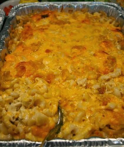 While the macaroni is cooking, combine the milks and eggs in a large bowl. Whisk until thoroughly combined. Add the butter, cheeses, sour cream, salt, pepper, and sugar and stir to combine. Pour over the macaroni and stir to combine. Top with the grated mild Cheddar cheese.