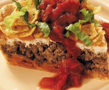 In a medium skillet, cook beef and onions until beef is browned and cooked thoroughly. Drain. Add Salsa and taco seasoning. Cook until boiling. Pour into crust. Bake for 25 minutes, or until crust is golden brown. Let cool for 5 minutes.