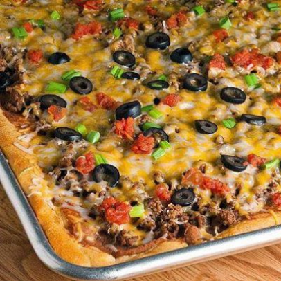 Top with cooked beef mixture, sprinkle with cheese followed by tomatoes, black olives and green onion. Return to oven for 3-6 more minutes until cheese is melted. Serve immediately. Makes 12 main dish servings or 48 appetizers.